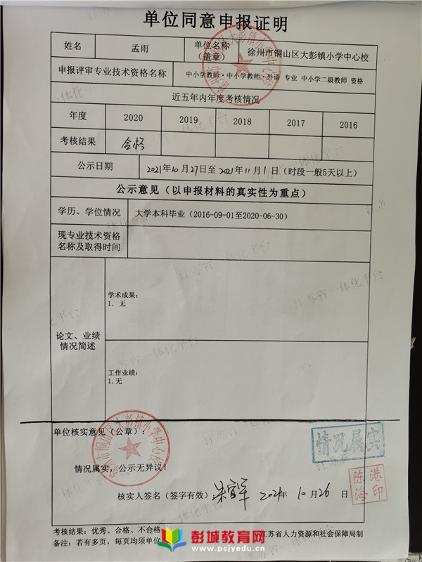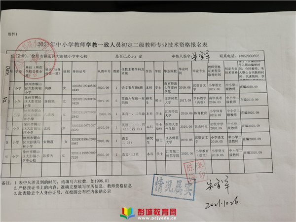 銅山區(qū)大彭鎮(zhèn)程莊小學(xué)2021年申報初級二級教師專業(yè)技術(shù)資格材料公示