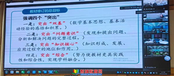通過目錄欄,我們明確本學(xué)期數(shù)與代數(shù)、圖形與幾何、綜合與實(shí)踐對(duì)應(yīng)的相關(guān)內(nèi)容,在此環(huán)節(jié),翟校長(zhǎng)提出教材修訂的總目標(biāo)中強(qiáng)調(diào)四個(gè)“突出”: