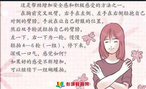 學習蝴蝶拍。雙手交叉在胸前,輕抱自己對側的肩膀或上臂,雙手交替輕拍自已的肩膀或上臂,用自己感覺舒服的輕重拍,以時鐘的秒“滴答滴答”或者1、2數(shù)數(shù)為輕拍的速度,左右交替各拍1次為一組,每次一般進行4-6組,速度不要過快。
