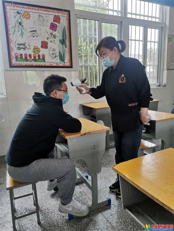 各班主任提前到教室打開門窗通風(fēng),并在教室門口迎接學(xué)生,手持體溫槍測量學(xué)生的體溫。學(xué)生們間隔一米在教室外排隊測量體溫,體溫正常者,進(jìn)入教室分散就座。