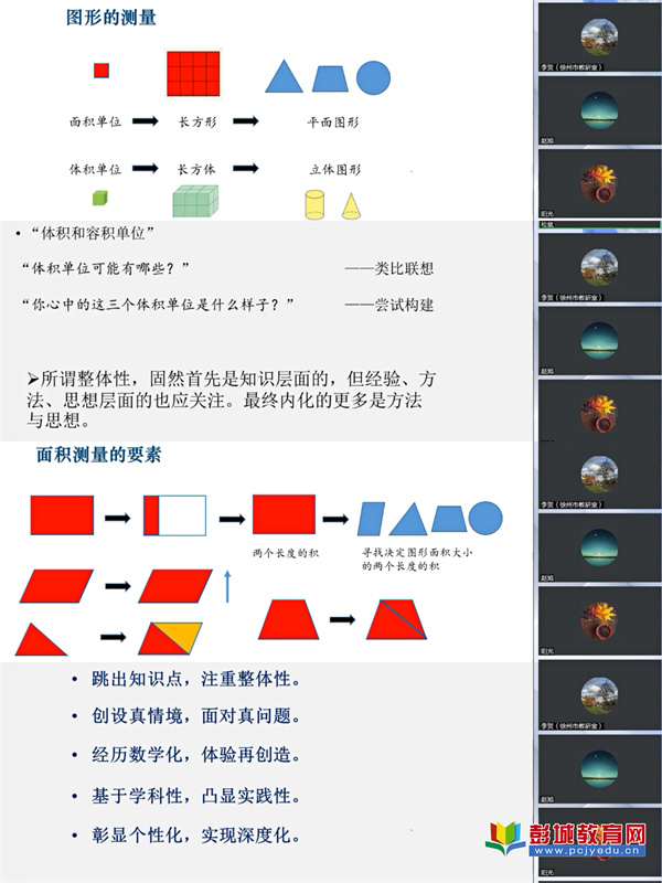 郭老師談到,聚焦核心素養(yǎng)的課程目標(biāo)要從數(shù)學(xué)知識的學(xué)習(xí)歷程、組織方式、演進(jìn)路徑,把握課程內(nèi)容的育人價(jià)值、整體結(jié)構(gòu)和內(nèi)存邏輯。立足生命成長的課程實(shí)施要跳出知識點(diǎn),注重整體性;創(chuàng)設(shè)真情境,面對真問題;經(jīng)歷數(shù)學(xué)化,體驗(yàn)再創(chuàng)造;基于科學(xué)性,凸顯實(shí)踐性;彰顯個(gè)性化,實(shí)現(xiàn)深度化。