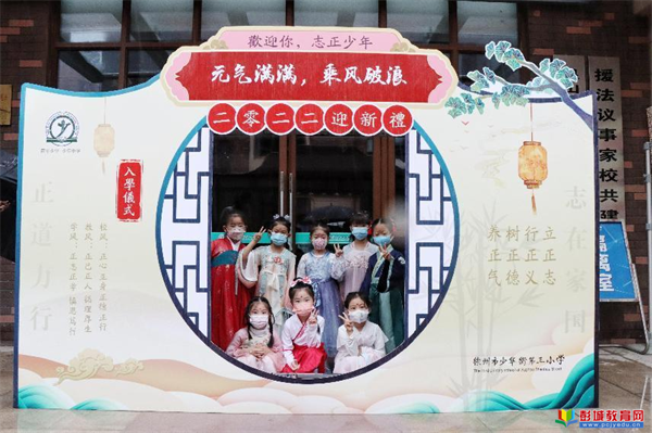 ??孩子們紛紛站在學(xué)校特制的留影框中,合影留念。
