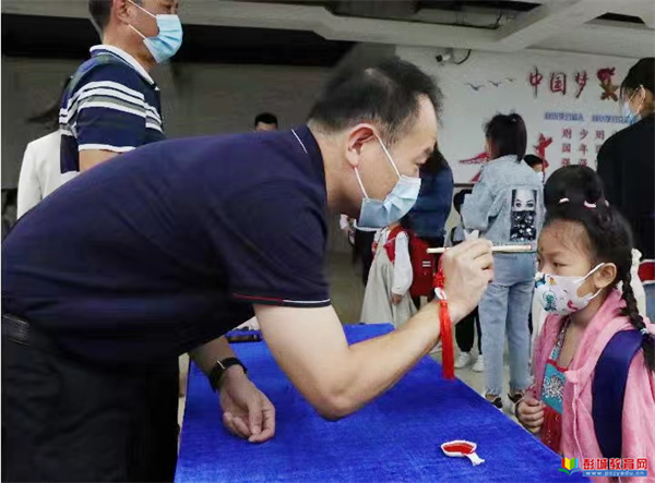 ??點(diǎn)朱砂啟心智,學(xué)校領(lǐng)導(dǎo)笑意盈盈,逐個(gè)為孩子們點(diǎn)朱砂,眉心之間輕輕一摁,一點(diǎn)紅色朱砂如智慧天眼印在孩子們的額頭上,寓意新生們從此心明眼亮,踏入智慧啟迪的大門,讀好書,好讀書,享受讀書之樂(lè)。