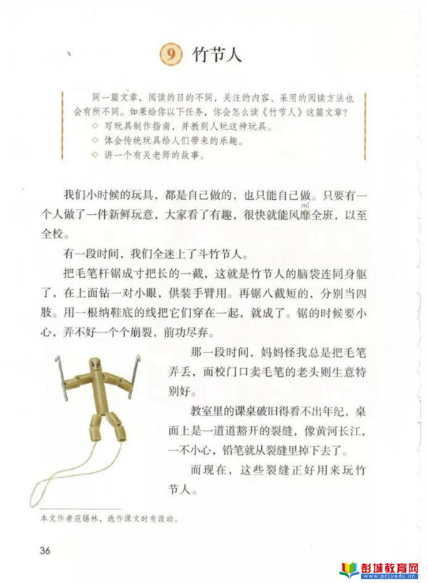 本文是一篇記敘文,講述了童年時(shí)代的“我”和伙伴們自己制作竹節(jié)人、斗竹節(jié)人的快樂。因?yàn)椤拔摇焙屯郎险n時(shí)偷玩斗竹節(jié)人,竹節(jié)人被老師沒收了,卻意外地發(fā)現(xiàn)老師也和“我們”一樣,也喜愛竹節(jié)人。