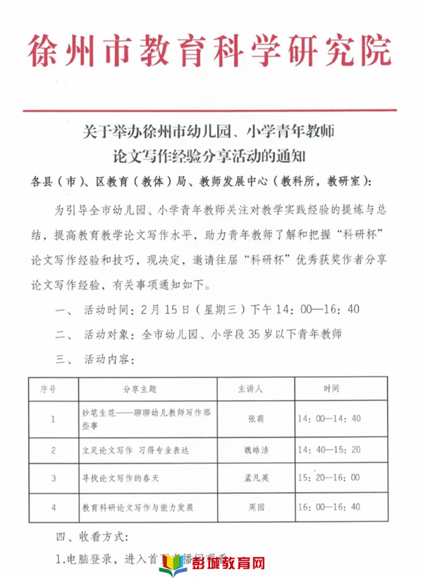 [摘要]:彭城教育:為引導(dǎo)教師關(guān)注對教學(xué)實踐經(jīng)驗的提煉與總結(jié),提高教育教學(xué)論文寫作水平,助力青年教師了解和把握“科研杯”論文寫作經(jīng)驗和技巧,2月15日,幼兒園組織教師觀看了“科研杯”論文寫作