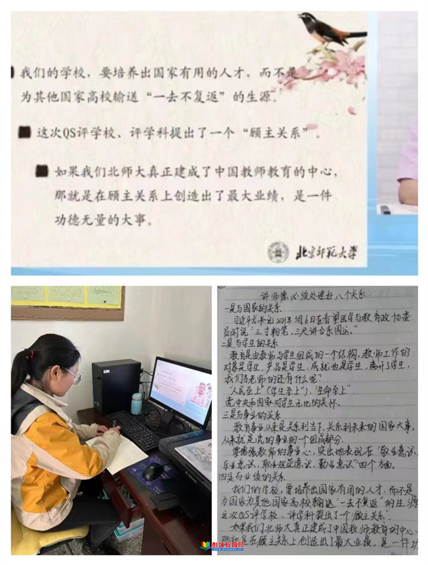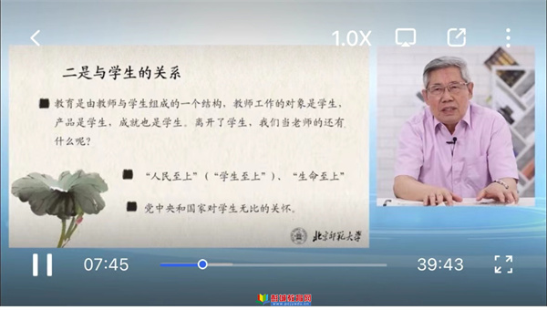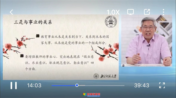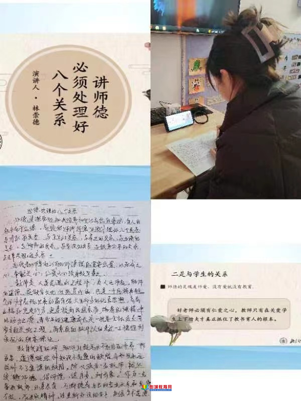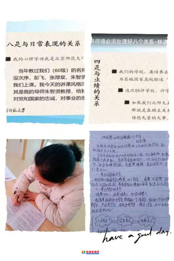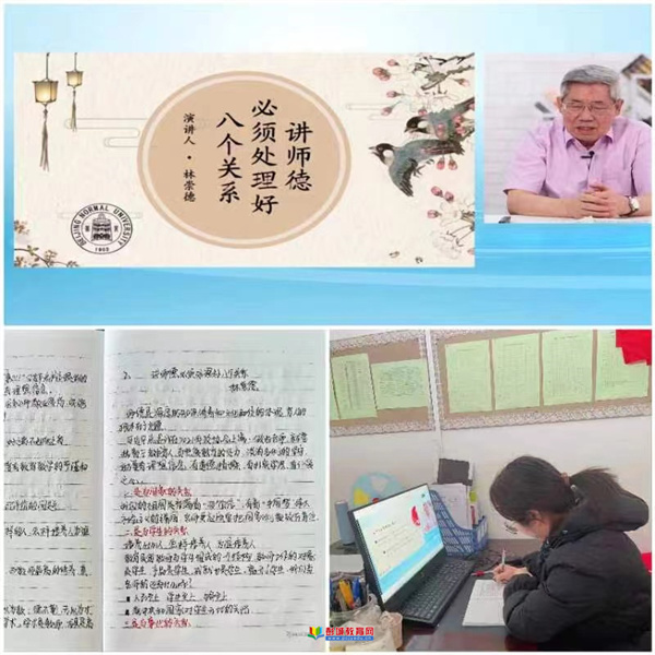 本次培訓(xùn)首先觀看了北京師范大學(xué)林崇德教授《講師德必須處理好八個(gè)關(guān)系》的講座。林教授在開篇提出:師德是深厚的知識(shí)修養(yǎng)和文化品位的體現(xiàn),育人的根本在于立德。