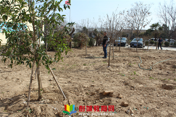 此次植樹點在教學樓前西南角一片空地。栽植現(xiàn)場,領導們帶頭示范,踩著泥濘,揮動鐵鍬,鏟土填坑,栽下一株株新苗。近幾日氣溫回升,天氣暖和。大家齊心協(xié)力,鼓足干勁,挖坑、培土、一陣忙碌之后。使這片空地變得綠意盎然。
