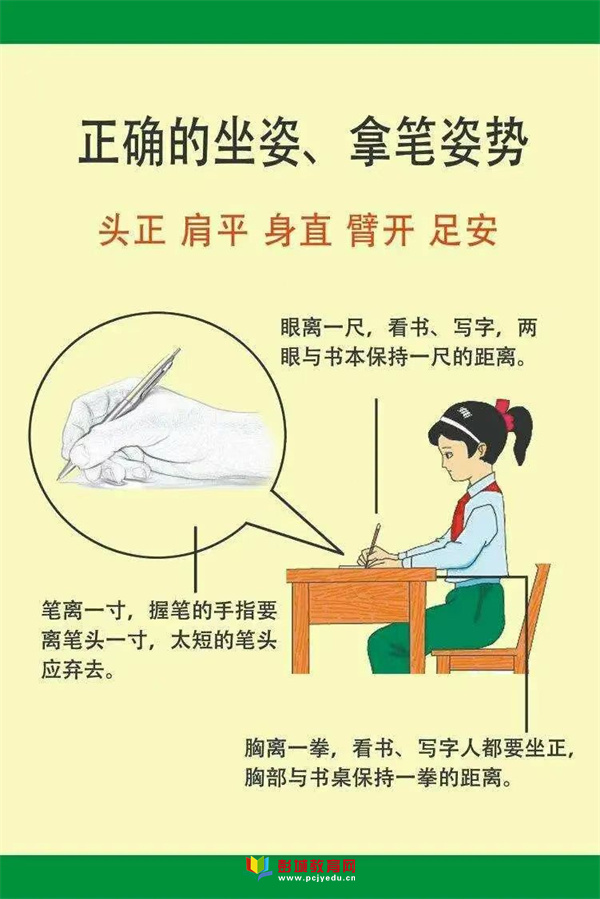 (1)讀書寫字身體要坐正,保持眼睛與書本距離為33—35厘米左右(一尺)、胸前與桌子距離應約一拳、 握筆的手指與筆尖距離應3厘米左右(一寸)。