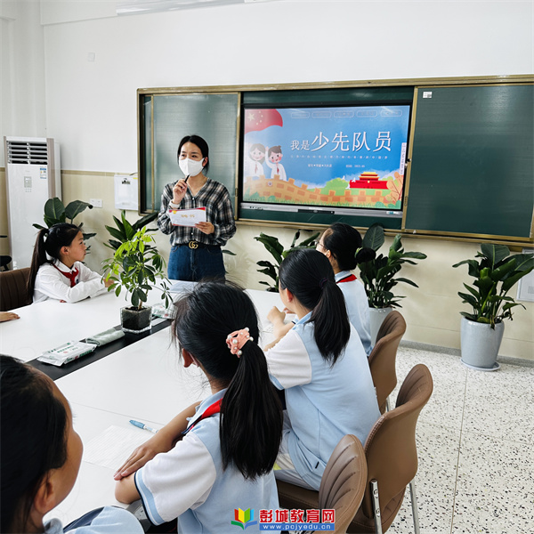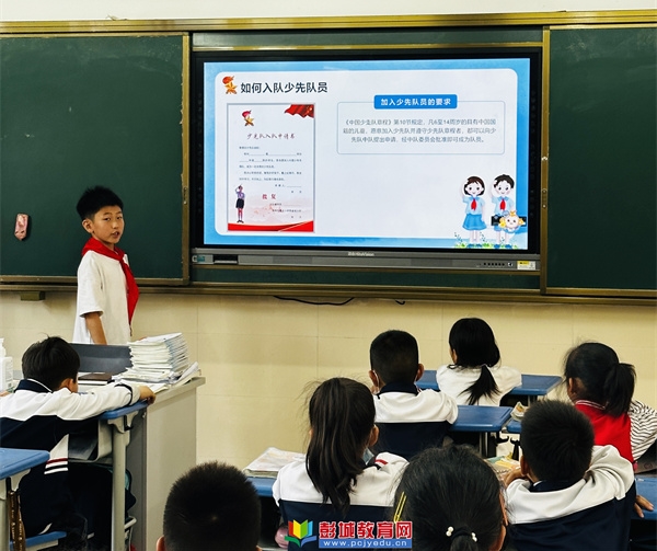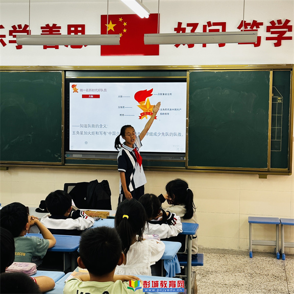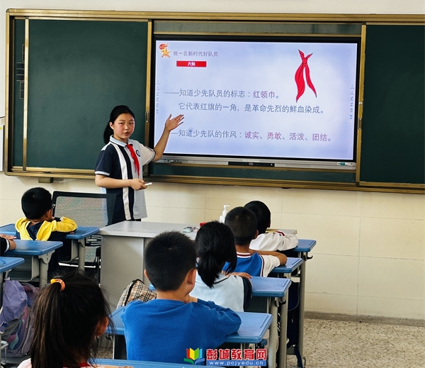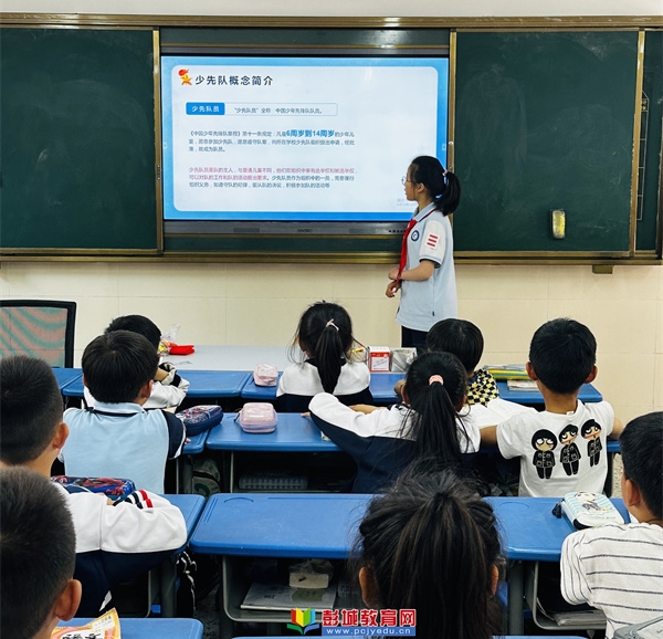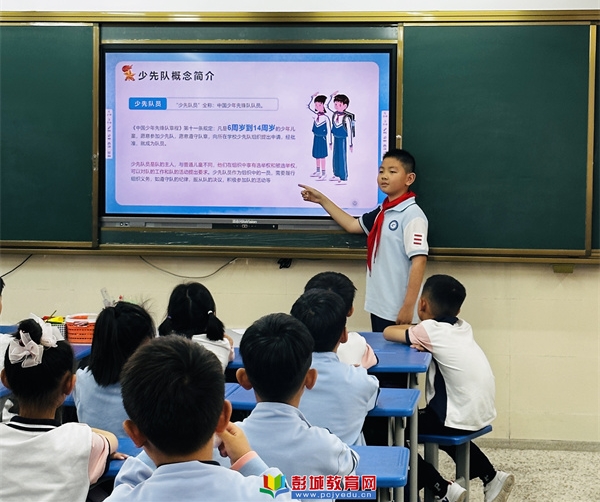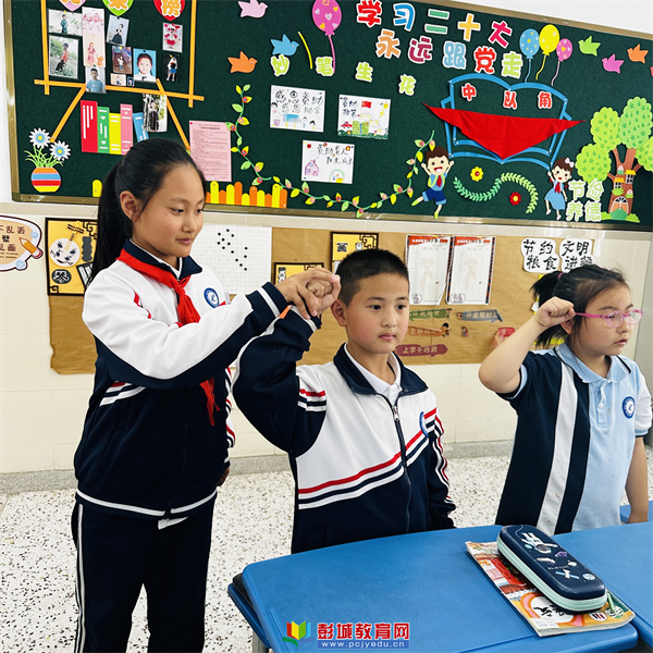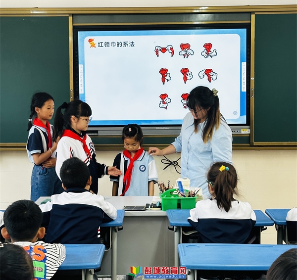 “領(lǐng)巾披在肩,左尖壓右尖,右尖繞一圈,圈中抽出尖?!蓖瑢W(xué)們一邊讀著口訣,一邊學(xué)習(xí)佩戴紅領(lǐng)巾,臉上洋溢著自豪和幸福。