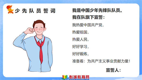 我是中國(guó)少年先鋒隊(duì)隊(duì)員。我在隊(duì)旗下莊嚴(yán)宣誓:我熱愛中國(guó)共產(chǎn)黨,熱愛祖國(guó),熱愛人民,好好學(xué)習(xí),好好鍛煉,準(zhǔn)備著:為共產(chǎn)主義事業(yè)貢獻(xiàn)力量!預(yù)備隊(duì)員們堅(jiān)定的誓言表達(dá)著對(duì)少先隊(duì)組織的崇敬和向往。