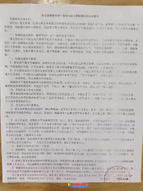 安全無(wú)小事,人人都有大責(zé)任。我們既做保育教育的責(zé)任人,又做幼兒安全的護(hù)航人,提高安全防范意識(shí),防患于未然,共同創(chuàng)設(shè)平安校園。希望所有孩子度過(guò)一個(gè)安全、文明、平安、快樂(lè)有意義的暑假。