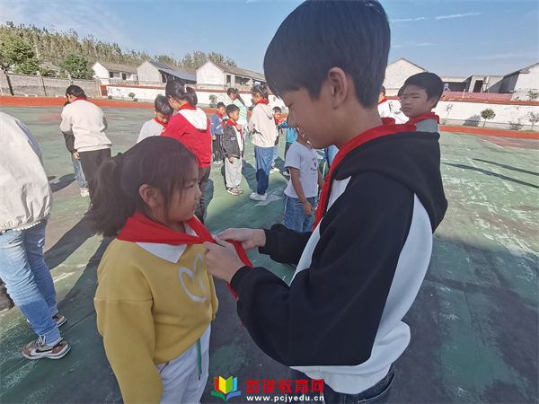 伴隨著激昂的出旗曲,小旗手高舉少先隊(duì)隊(duì)旗,踏著整齊的步伐來到運(yùn)動(dòng)場(chǎng)。全體少先隊(duì)員敬隊(duì)禮,高聲齊唱《中國(guó)少年先鋒隊(duì)隊(duì)歌》。在飄揚(yáng)的隊(duì)旗下,伴隨著音樂,老隊(duì)員們從新隊(duì)員手中接過鮮艷的紅領(lǐng)巾,將它整齊地佩戴在新隊(duì)員們的胸前,內(nèi)心抑制不住激動(dòng)之情。