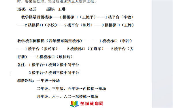 疏散至安全地帶后,各班迅速清點人數,以班級為單位向李主任報告。
