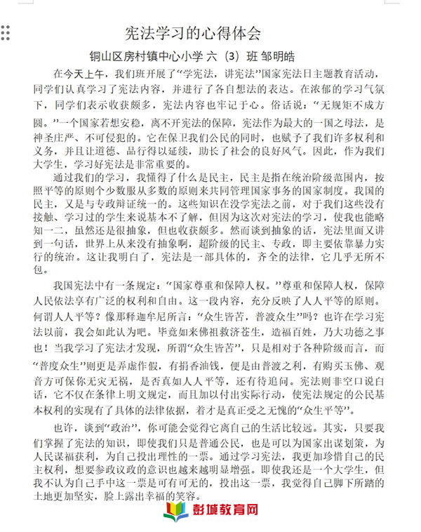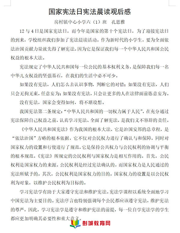 2023年12月4日是我國第十個國家憲法日。憲法是國家的根本大法,開展以憲法為核心的法治教育,對學生法治素養(yǎng)、推進現(xiàn)代教育治理、維護青少年合法權益具有重要意義。根據(jù)中宣部、司法部、全國普法辦2023年全國法治宣傳周工作安排,銅山區(qū)房村鎮(zhèn)中心小學于2023年12月4日國家憲法日舉行一系列憲法活動。