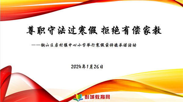 2024年1月26日,2024年寒假即將開啟之時,銅山區(qū)房村鎮(zhèn)中心小學召開了全體教師會進行“尊職守法過寒假 拒絕有償家教”師德承諾活動。