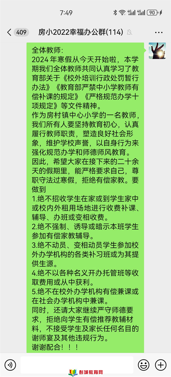 同時,老師們表示,將繼續(xù)嚴守師德要求,寒假期間拒絕向?qū)W生有償推薦教輔材料,不接受學生及家長任何名目的謝師宴及其他違規(guī)行為。自愿接受社會、百姓及同事監(jiān)督,以實際行動提高人們對房村教育的滿意度。