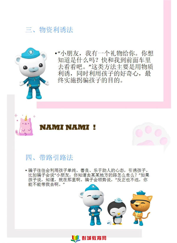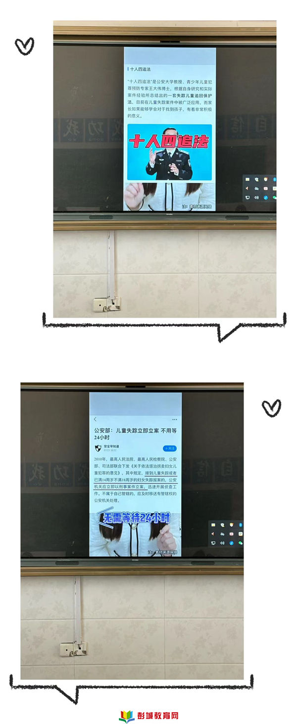 近年來,兒童走失、被拐事件常有發(fā)生,不法分子通常抓住孩子年齡小,缺少防范心理,容易聽信別人的特點(diǎn),利用引誘、恐嚇等手段實(shí)施犯罪。為防止拐騙事件的發(fā)生,一(4)班朱伽桐的媽媽給孩子帶來了一節(jié)安全教育課《兒童防誘拐騙安全教育課》。孩子一個(gè)個(gè)聽的津津有味。