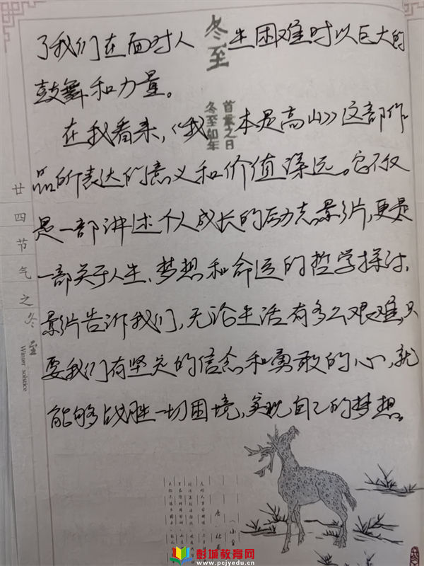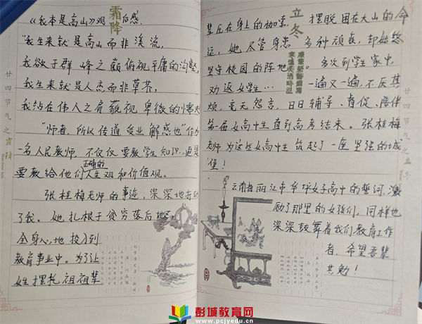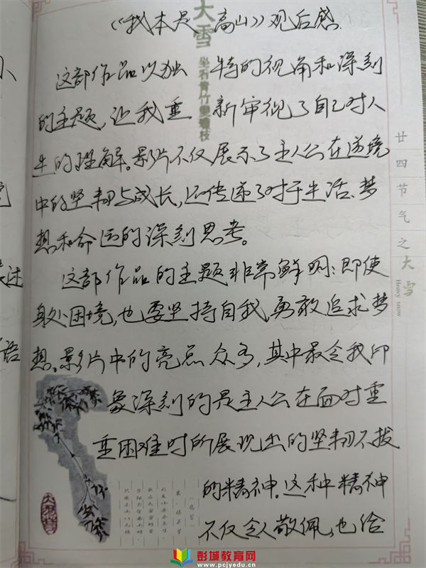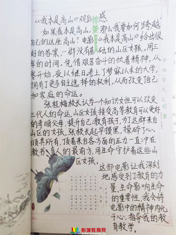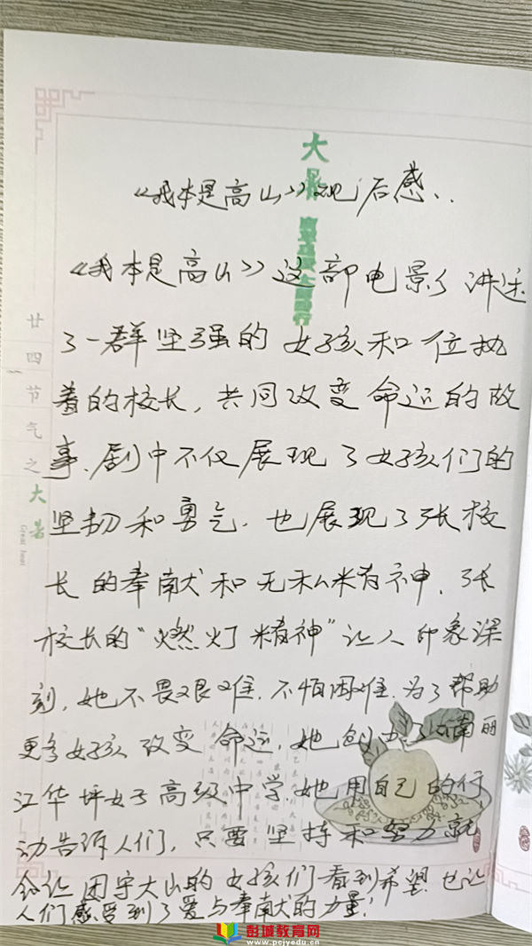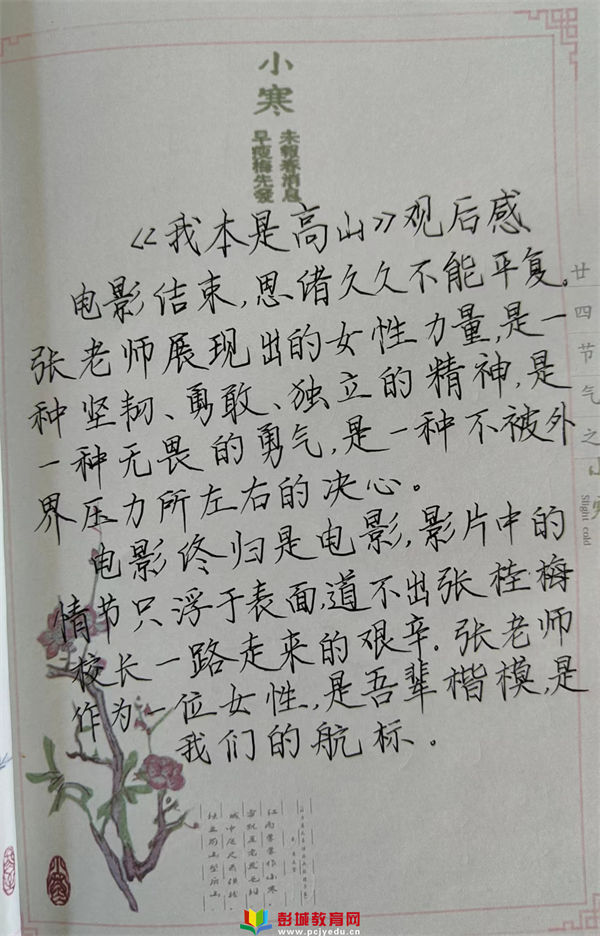 ??鶴發(fā)銀絲映日月,丹心熱血沃新花。田莊校區(qū)的教師們深耕三尺講臺(tái),潛心教書(shū)育人,在這特殊的日子里,為升華教師們精神面貌和自強(qiáng)不息的巾幗風(fēng)采,范校長(zhǎng)邀請(qǐng)全體女教師和“全國(guó)教書(shū)育人楷?!睆埞鹈沸iL(zhǎng)一起過(guò)“女神節(jié)”,觀(guān)看電影《我本是高山》。教師們被張桂梅校長(zhǎng)的“有志向、堅(jiān)持目標(biāo);有擔(dān)當(dāng),勇往直前;有毅力,無(wú)私奉獻(xiàn)”的精神深深吸引,紛紛用溫情的筆觸把所觀(guān)所感躍然紙上。