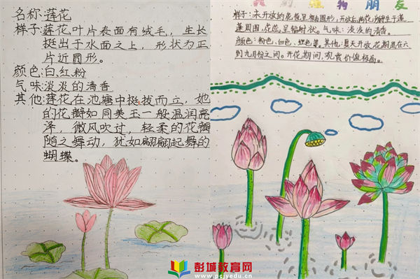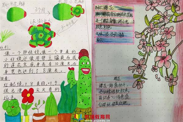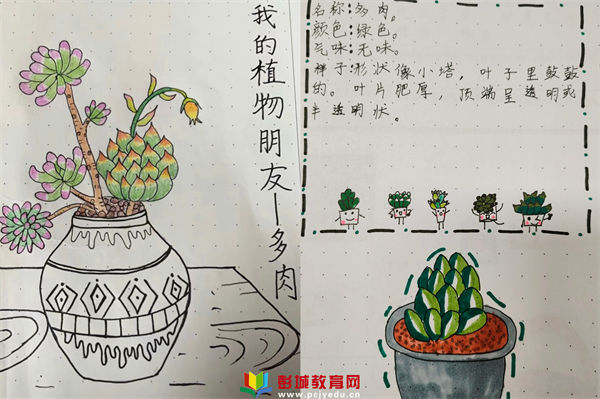 細致的觀察之后,同學們采用圖配文的方式制作記錄卡,有的同學用準確生動的語言描述著植物的形態(tài)特征,有的同學引用學過的古詩贊美,有的同學用精湛的繪畫技巧將植物的形態(tài)栩栩如生地表現(xiàn)出來,有的同學持續(xù)觀察、詳細記錄植物的變化。