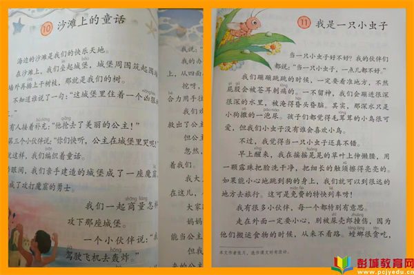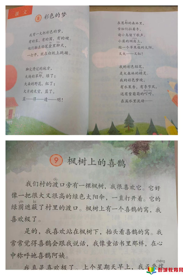 本單元以“童心”為主題,編排了《彩色的夢》《楓樹上的喜鵲》《沙灘上的童話》《我是一只小蟲子》四篇課文,內(nèi)容富有童心童趣。四篇課文題材多樣,有兒童詩、兒童散文和兒童故事。四篇課文都是以第一人稱來寫的,都充滿了豐富的想象,但想象的角度各不相同,各具特色。