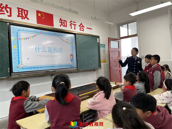 課堂上,漢王稅務(wù)分局的干部們精心準(zhǔn)備,帶著豐富的稅法知識和熱情洋溢的笑容,結(jié)合學(xué)生們的年齡特點(diǎn)和認(rèn)知水平,運(yùn)用通俗易懂的語言和生動形象的圖文、動漫視頻,深入淺出地為同學(xué)們講解了“稅”的含義、稅收的起源、發(fā)展、種類和用途等基礎(chǔ)知識。
