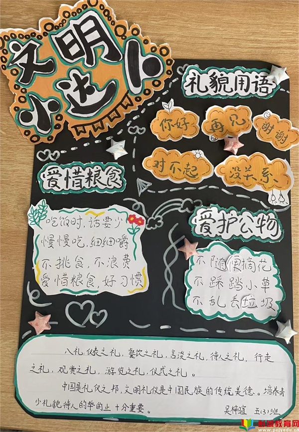 通過此次活動,為學生提供了展示才藝的平臺,他們的書寫、繪畫等能力得到鍛煉,讓同學們進一步了解文明禮儀,將文明禮儀根植于心。文明禮儀在日常學習和生活中具有重要意義。學校將以此為契機,將文明禮儀教育作為德育工作的重點,在全校形成人人講文明、尊禮儀的濃厚氛圍。