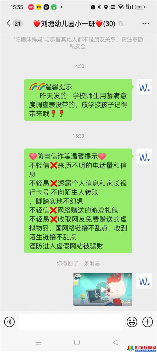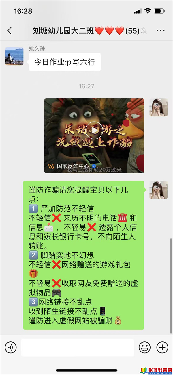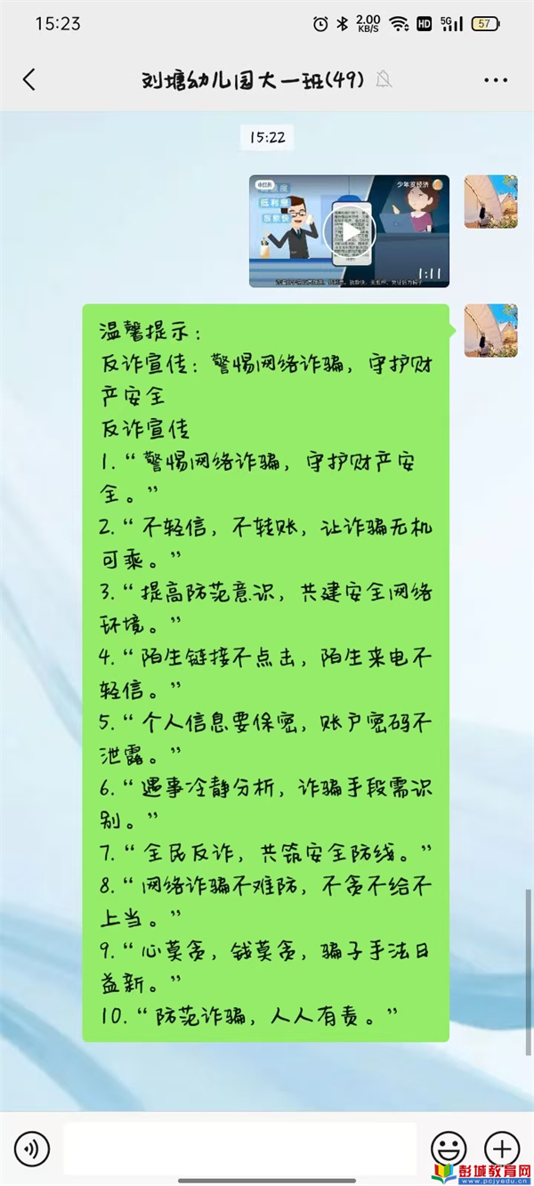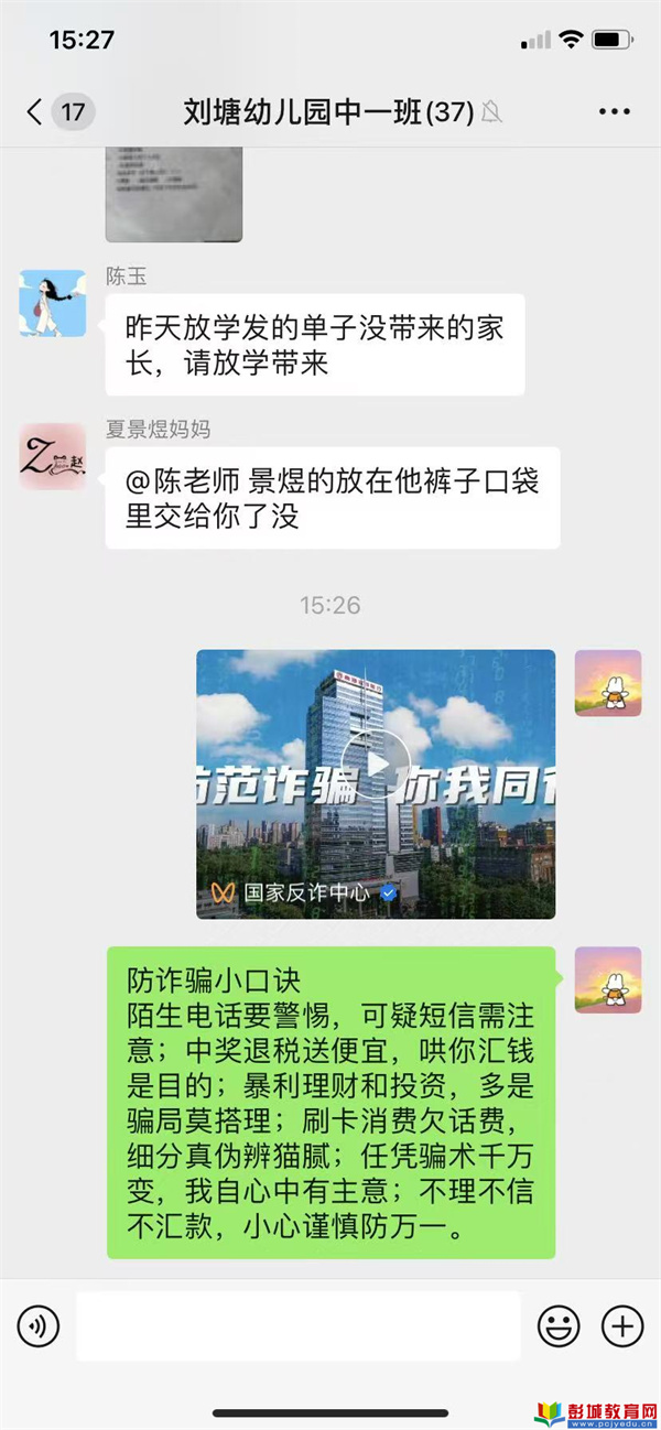 此外通過班級群向家長推送防詐騙宣傳視頻幫助家長識別、預(yù)防和拒絕詐騙的意識。