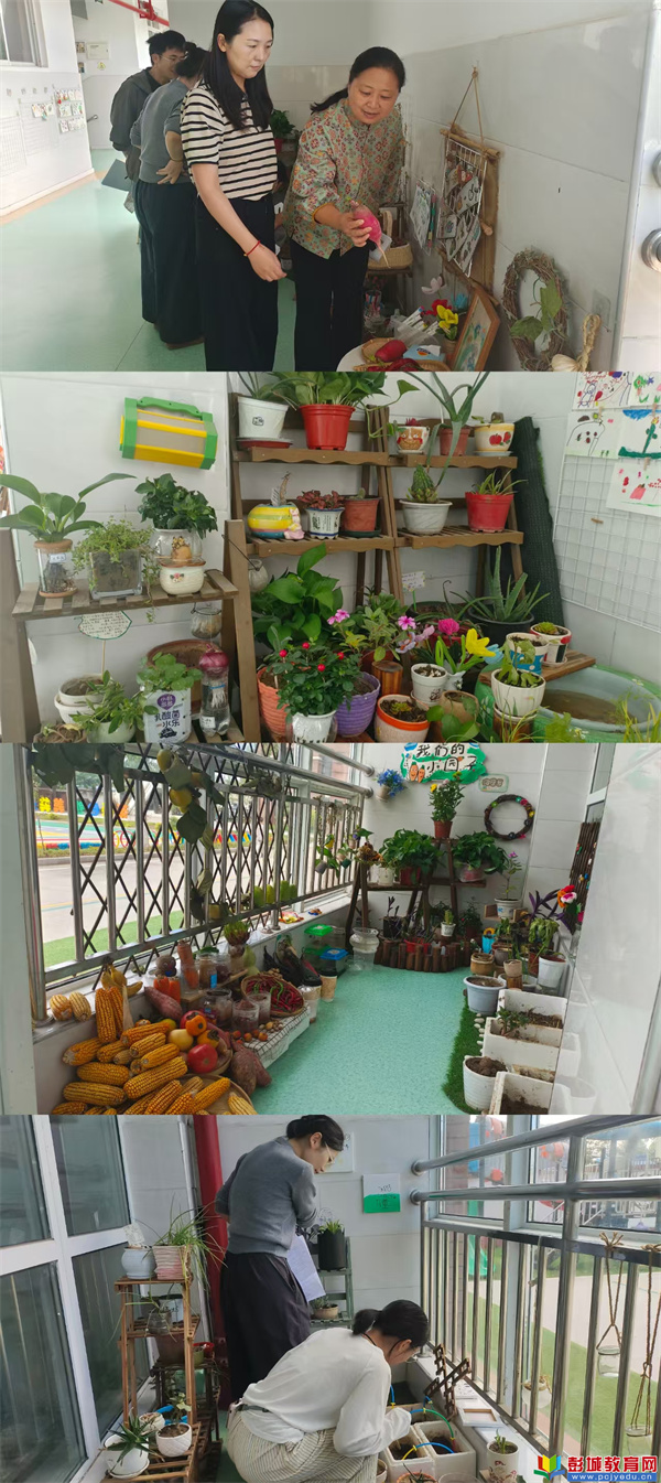 在活動中,郭園長、陶園長帶領全體教師深入各班自然角觀摩學習。各班充分結合幼兒認知特點,將自然角打造成充滿生機的“微型自然世界”,五大區(qū)域各有巧思:種植區(qū)里,大蒜冒出嫩綠新芽,青菜舒展翠綠葉片,幼兒手寫的“植物照顧打卡表”貼在旁側,記錄著每日澆水、松土的小點滴;觀賞區(qū)精心搭配了多肉拼盤、干花擺件與彩色石子,部分班級還加入幼兒手繪的植物小卡片,讓觀賞與創(chuàng)意結合;水培區(qū)成為“根系觀察課堂”,山藥長出細長須根,紅薯萌發(fā)翠綠新葉,土豆在透明玻璃瓶中舒展根系,幼兒能直觀看到植物在水中的生長變化;飼養(yǎng)角里,小烏龜緩慢爬動曬著“日光浴”,小泥鰍在清水里靈活穿梭,小青蛙蹲在荷葉造型的小窩中,幼兒自制的“小動物喂食指南”清晰標注著喂食時間與食量,滿是童真與責任;曬秋區(qū)則充滿豐收氛圍,金黃玉米串、鮮紅辣椒串懸掛在木架上,曬干的紅棗、豆角平鋪在桌面上,讓幼兒在幼兒園就能感受秋日豐收的喜悅。觀摩過程中,教師們圍繞區(qū)域創(chuàng)設、幼兒參與度、教育價值等展開熱烈交流,在互學互鑒中完善自然角創(chuàng)設思路。