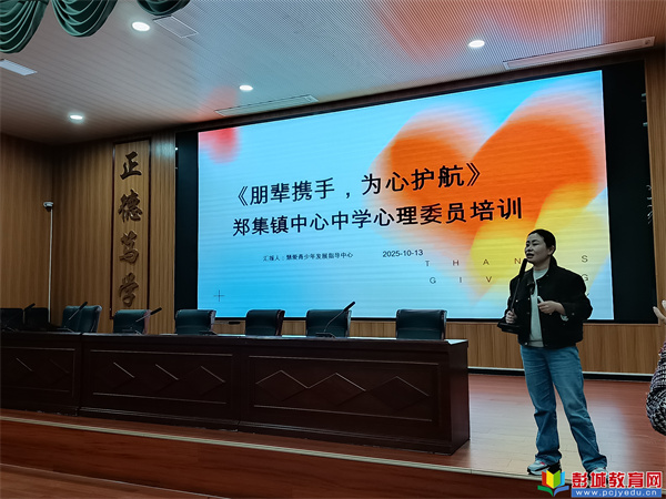 為進(jìn)一步加強(qiáng)學(xué)校心理健康教育工作,引進(jìn)社會(huì)工作專業(yè)師資,探索學(xué)校社會(huì)工作賦能心理健康新模式,充分發(fā)揮心理委員在學(xué)生心理健康維護(hù)中的朋輩互助作用,2025年10月13日,鄭集鎮(zhèn)中心中學(xué)聯(lián)合慧愛(ài)青少年發(fā)展指導(dǎo)中心開(kāi)展了以“朋輩攜手,為心護(hù)航”為主題的心理委員培訓(xùn)活動(dòng)。