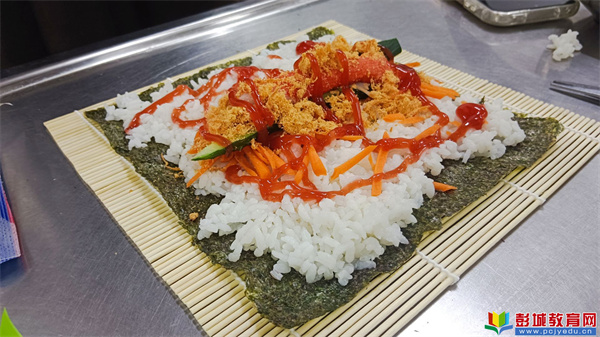 活動(dòng)前,老師們提前做好萬全準(zhǔn)備:將蒸得軟糯的米飯分盒裝好,切好新鮮的黃瓜條、胡蘿卜條、火腿條,備好獨(dú)立包裝的海苔、卷簾和一次性手套,確保食材安全又方便幼兒操作?;顒?dòng)開始后,老師先用童趣的語言示范壽司制作步驟:“先給卷簾鋪上海苔‘小被子’,再把米飯‘寶寶’輕輕鋪勻,別忘了留一點(diǎn)點(diǎn)邊邊哦!”孩子們瞪著圓溜溜的眼睛認(rèn)真觀察,小手忍不住跟著比劃。