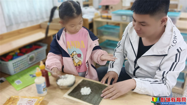 輪到親子實(shí)操時(shí),現(xiàn)場(chǎng)瞬間變成歡樂的“小廚房”。有的小朋友小心翼翼地捏起米飯,卻不小心粘得滿手都是,惹得家長哈哈大笑;有的家庭分工明確,媽媽鋪米、寶寶放料,爸爸負(fù)責(zé)卷緊,合作完成的“專屬壽司”剛做好,孩子就迫不及待遞到家長嘴邊:“媽媽你先吃!”還有的家長拿起手機(jī),記錄下孩子專注鋪料、用力卷壽司的可愛瞬間,溫馨的畫面在活動(dòng)室里處處可見。