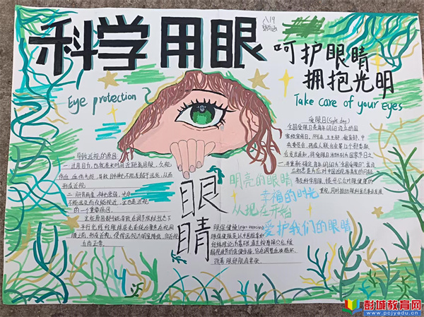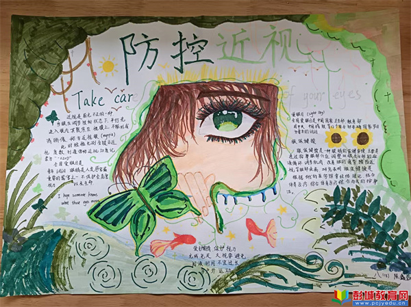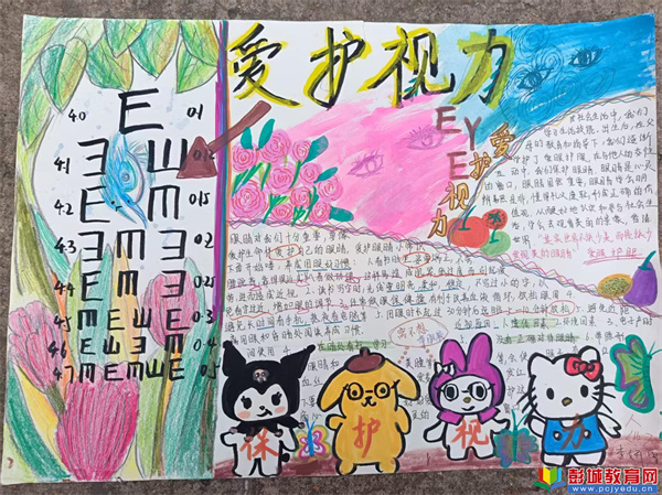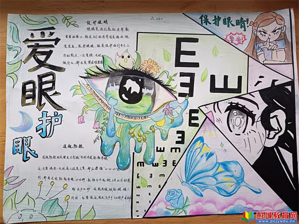 內(nèi)容編排上,同學(xué)們更是細(xì)致用心。他們或講解近視成因,科普“讀寫姿勢三個(gè)一”(眼離書一尺、胸離桌一拳、手離筆尖一寸)、“上網(wǎng)時(shí)長不超一小時(shí)”等用眼規(guī)范;或分享眼保健操的正確做法,介紹胡蘿卜、青菜等護(hù)眼食材的營養(yǎng)功效;還結(jié)合視力表、眼鏡等視覺符號(hào),生動(dòng)傳遞“愛護(hù)視力要從日常點(diǎn)滴做起”的理念。每一份手抄報(bào)都是同學(xué)們對(duì)愛眼護(hù)眼知識(shí)的系統(tǒng)梳理,字里畫間滿是他們對(duì)清晰視界的珍視與追求。