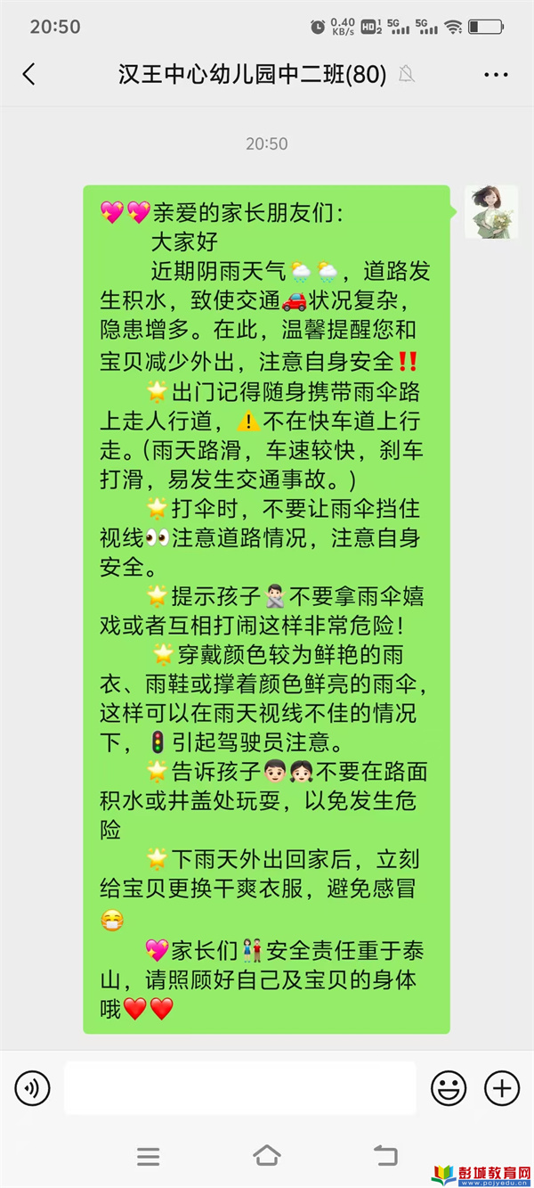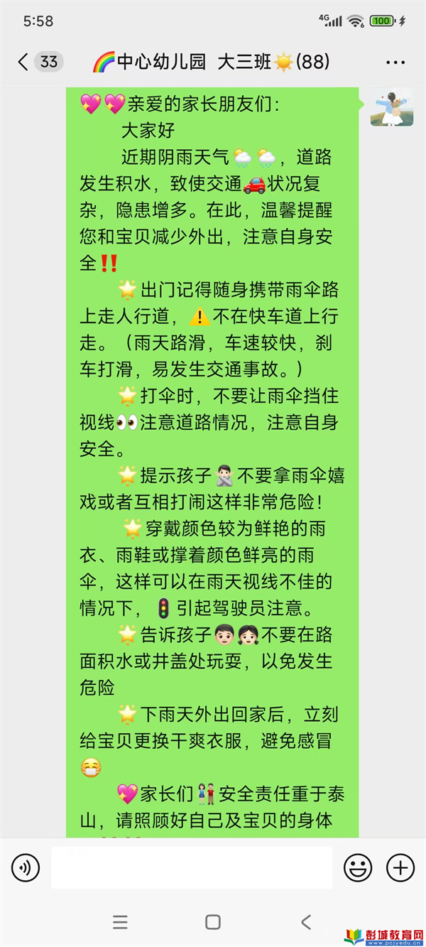 此外,幼兒園還通過家長群向全體家長推送雨天安全提示,提醒家長接送幼兒時遵守交通規(guī)則,做好幼兒保暖和防護(hù)措施,形成“家園共育”的安全防護(hù)合力。